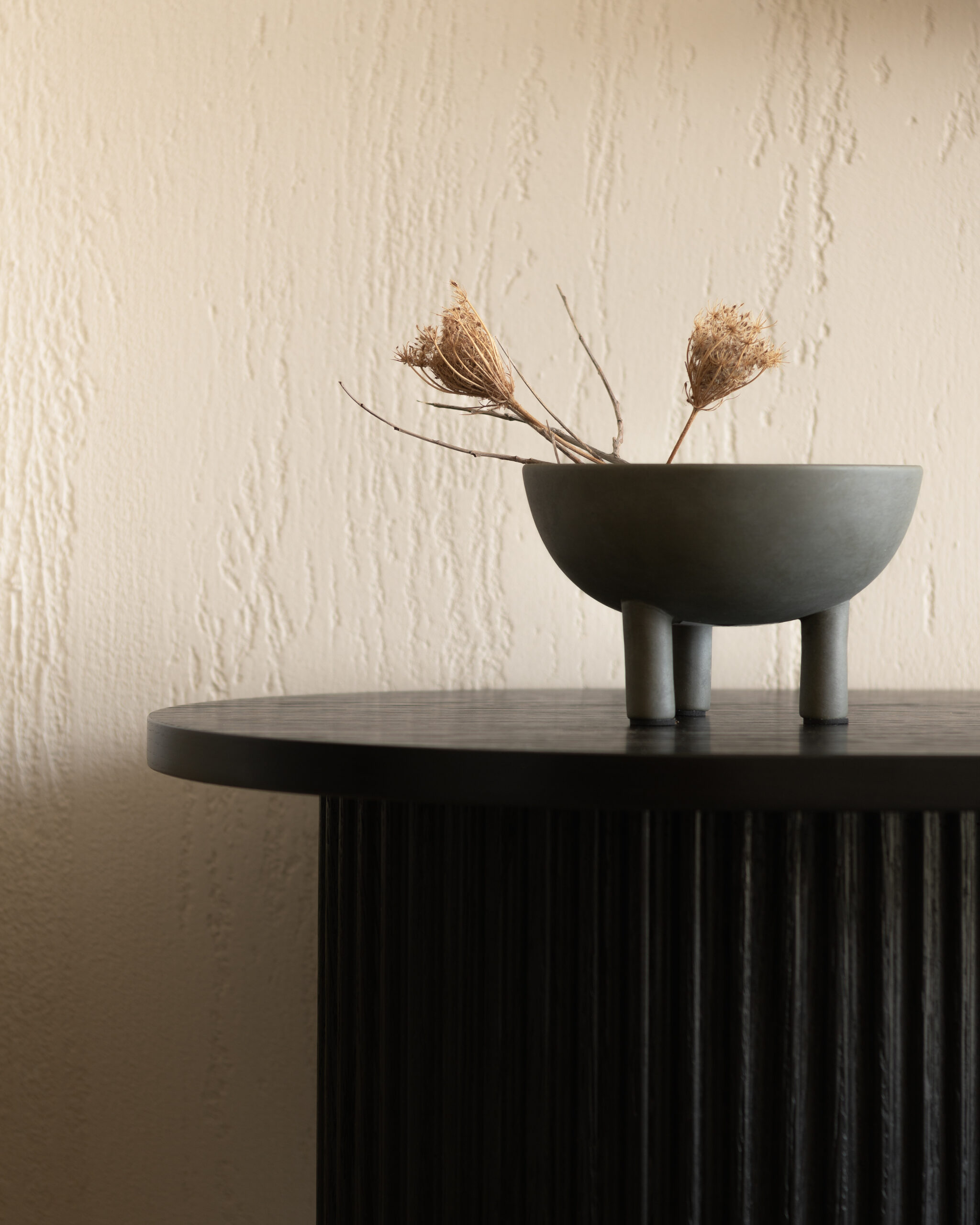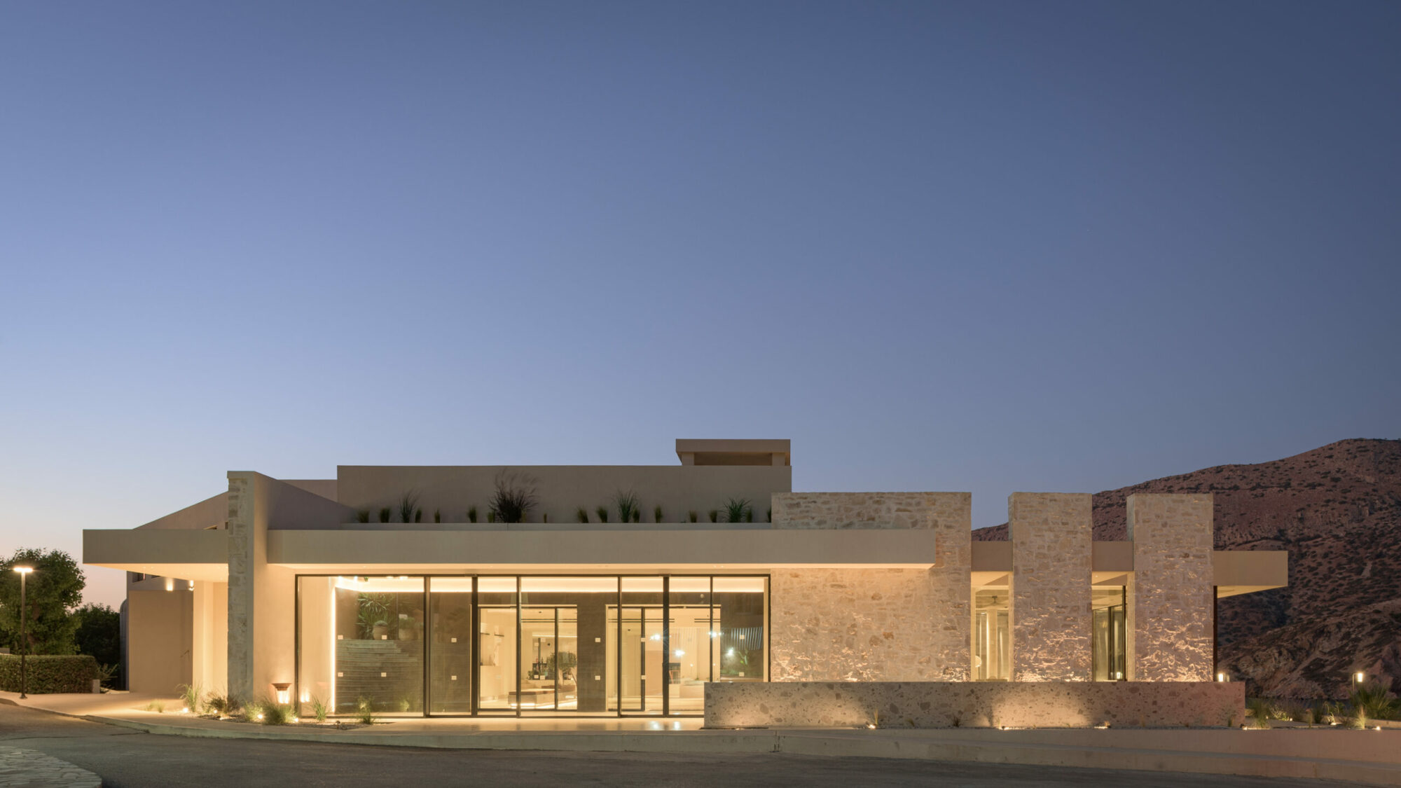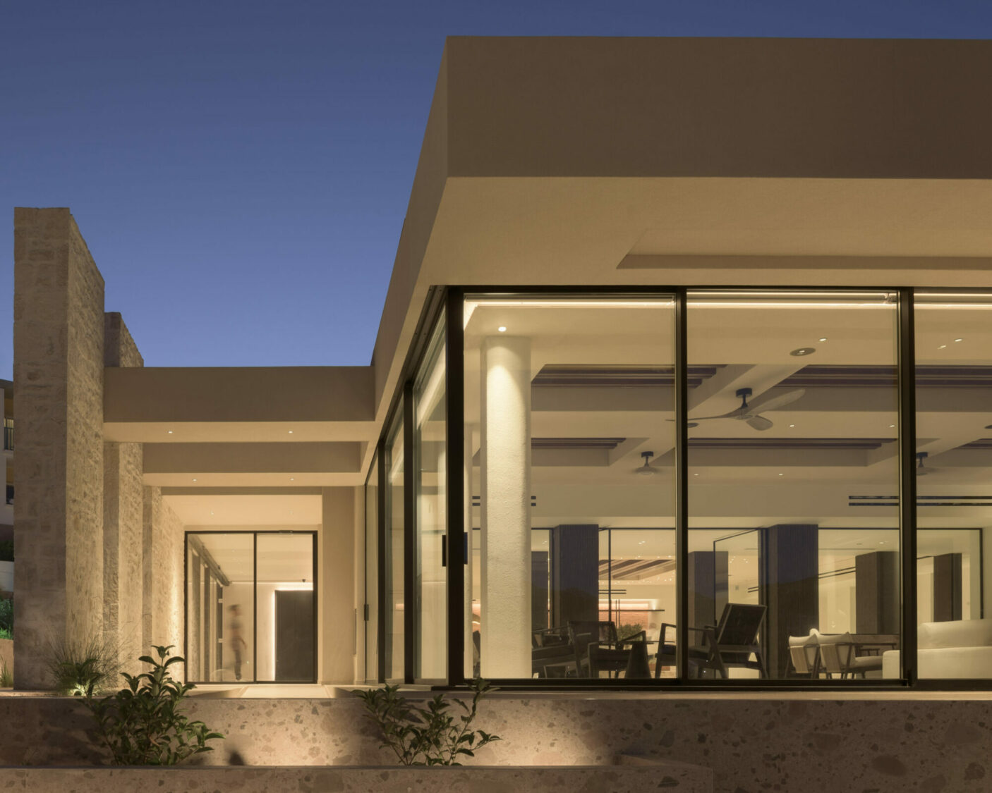 Οι χώροι χαρακτηρίζονται από καθαρές γεωμετρικές γραμμές και έναν ισορροπημένο συνδυασμό σκούρων γήινων αποχρώσεων και φυσικών υλικών, όπως πέτρα, ξύλο και μέταλλο. Οι μεγάλες γυάλινες επιφάνειες ενισχύουν τη σύνδεση με το εξωτερικό περιβάλλον, προσφέροντας ανεμπόδιστη θέα στη θάλασσα και μια αίσθηση αρμονίας μεταξύ εσωτερικού και εξωτερικού χώρου.