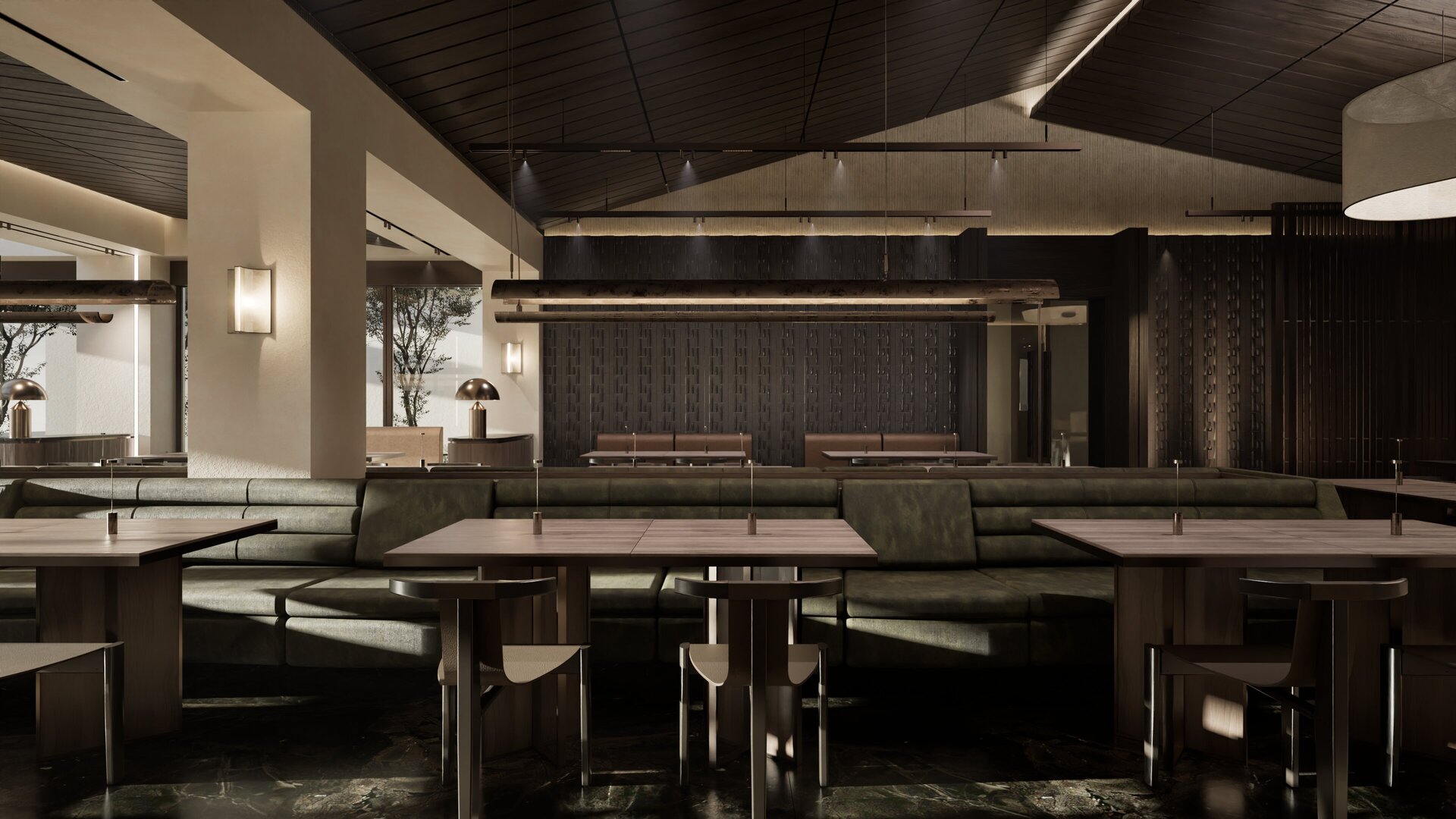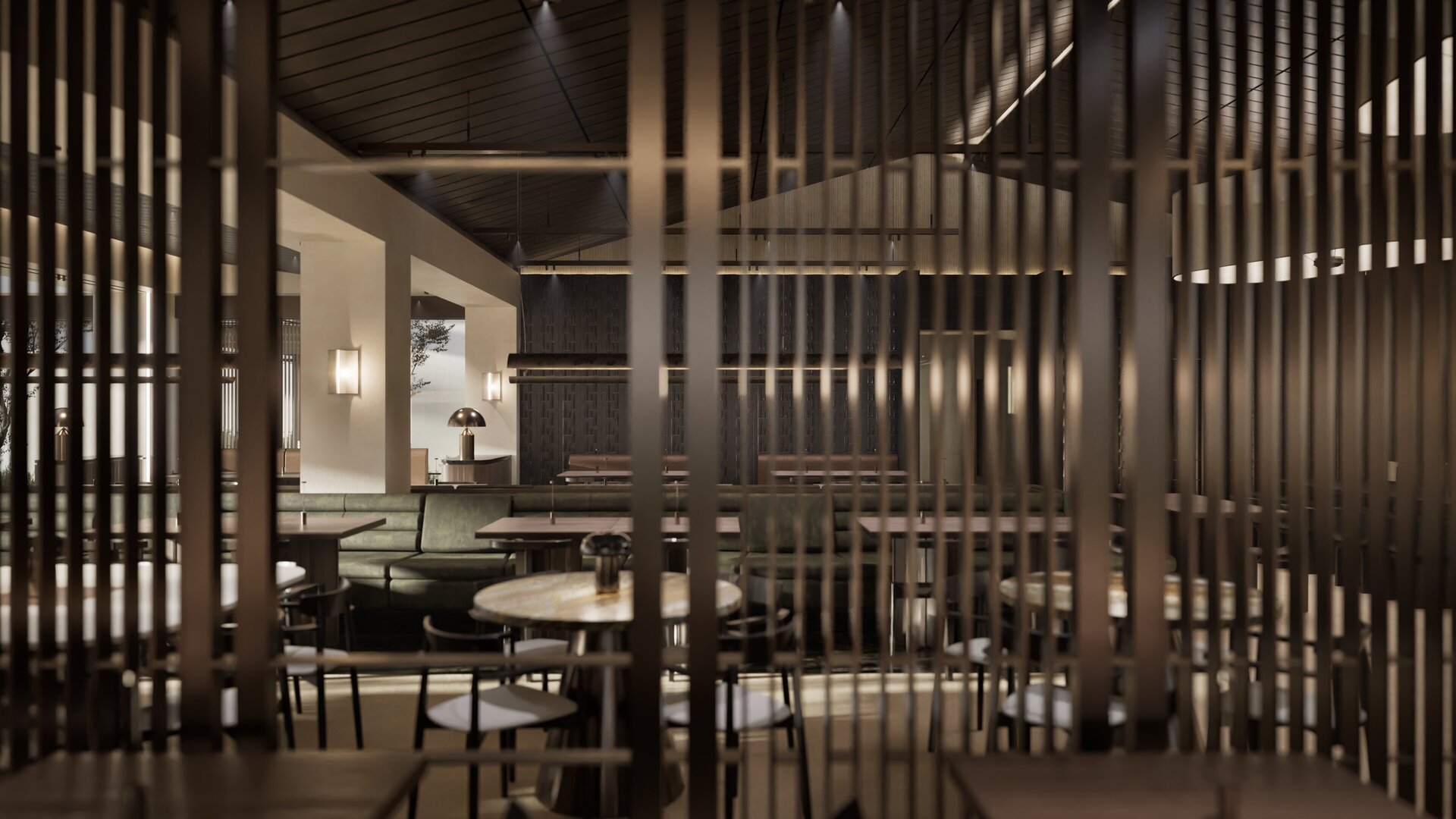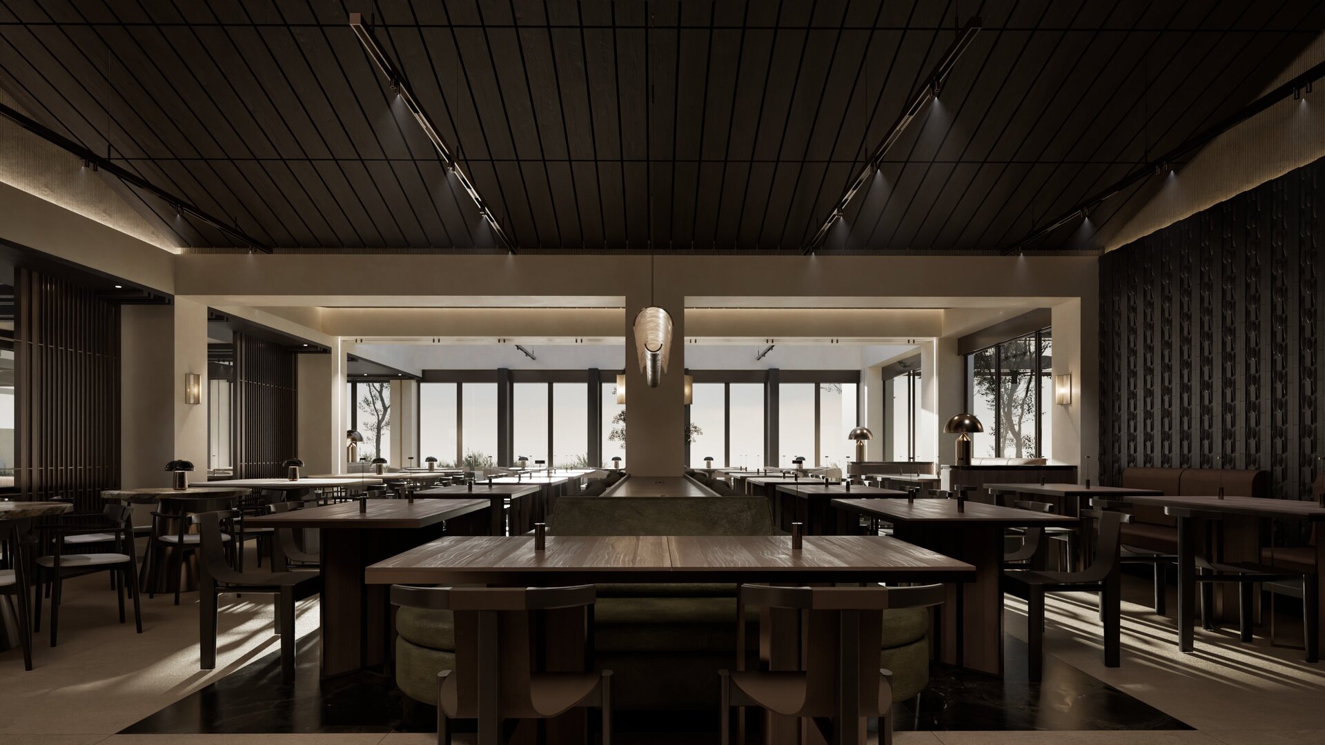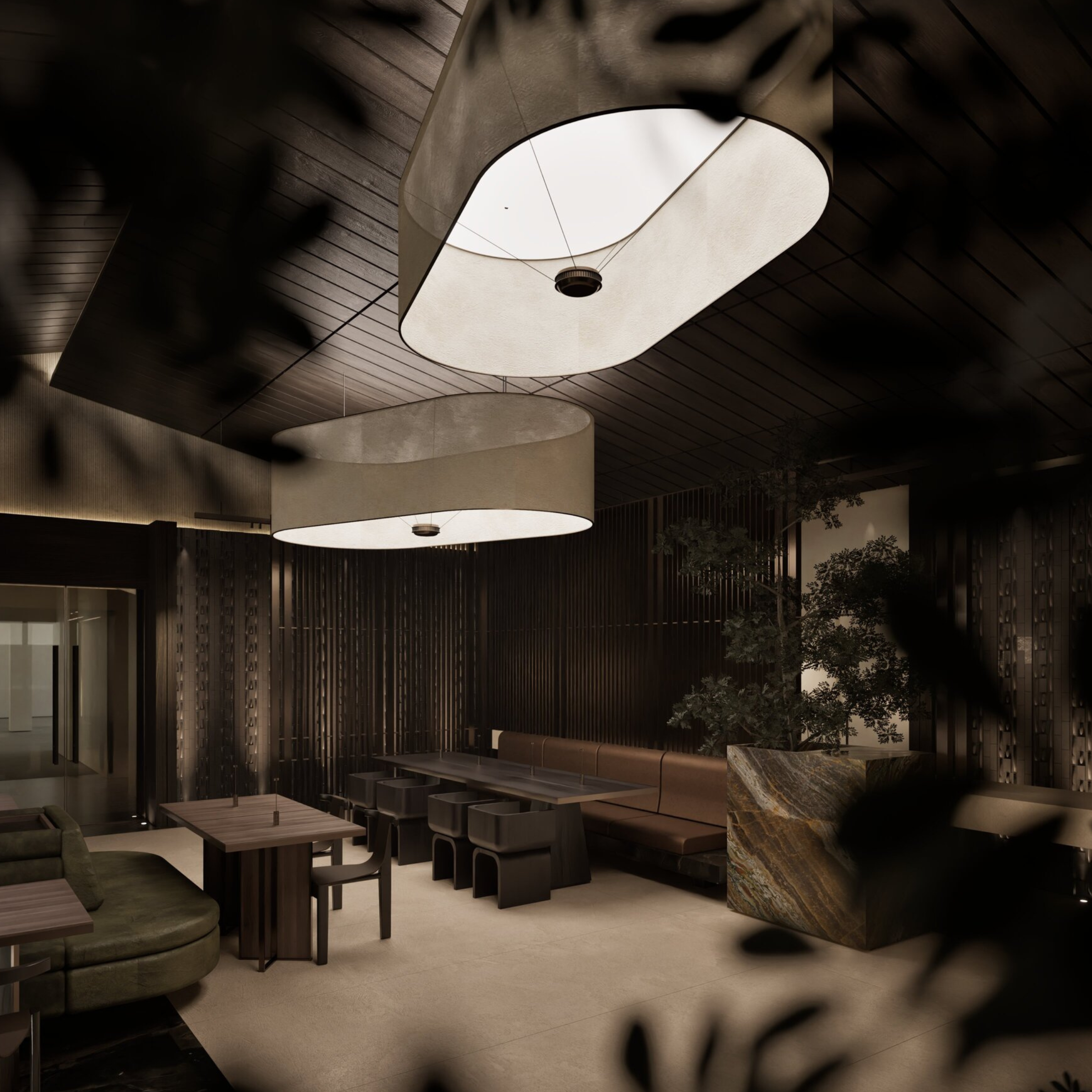 Ο χειρισμός της ατμόσφαιρας διαδραματίζει καθοριστικό ρόλο, καθώς το φως αλληλεπιδρά άμεσα και έμμεσα με τις επιφάνειες, αντανακλάται σε διαφορετικά επίπεδα και υλικά και δημιουργεί μεταβαλλόμενες και ενδιαφέρουσες χωρικές ποιότητες. Η υλικότητα του χώρου κινείται σε σκουρόχρωμη χρωματική παλέτα, η οποία, σε συνδυασμό με την επιλογή υλικών υψηλής ποιότητας και αυξημένης αντοχής, ενισχύει τον εσωστρεφή, ατμοσφαιρικό και διαχρονικό χαρακτήρα του εστιατορίου.
