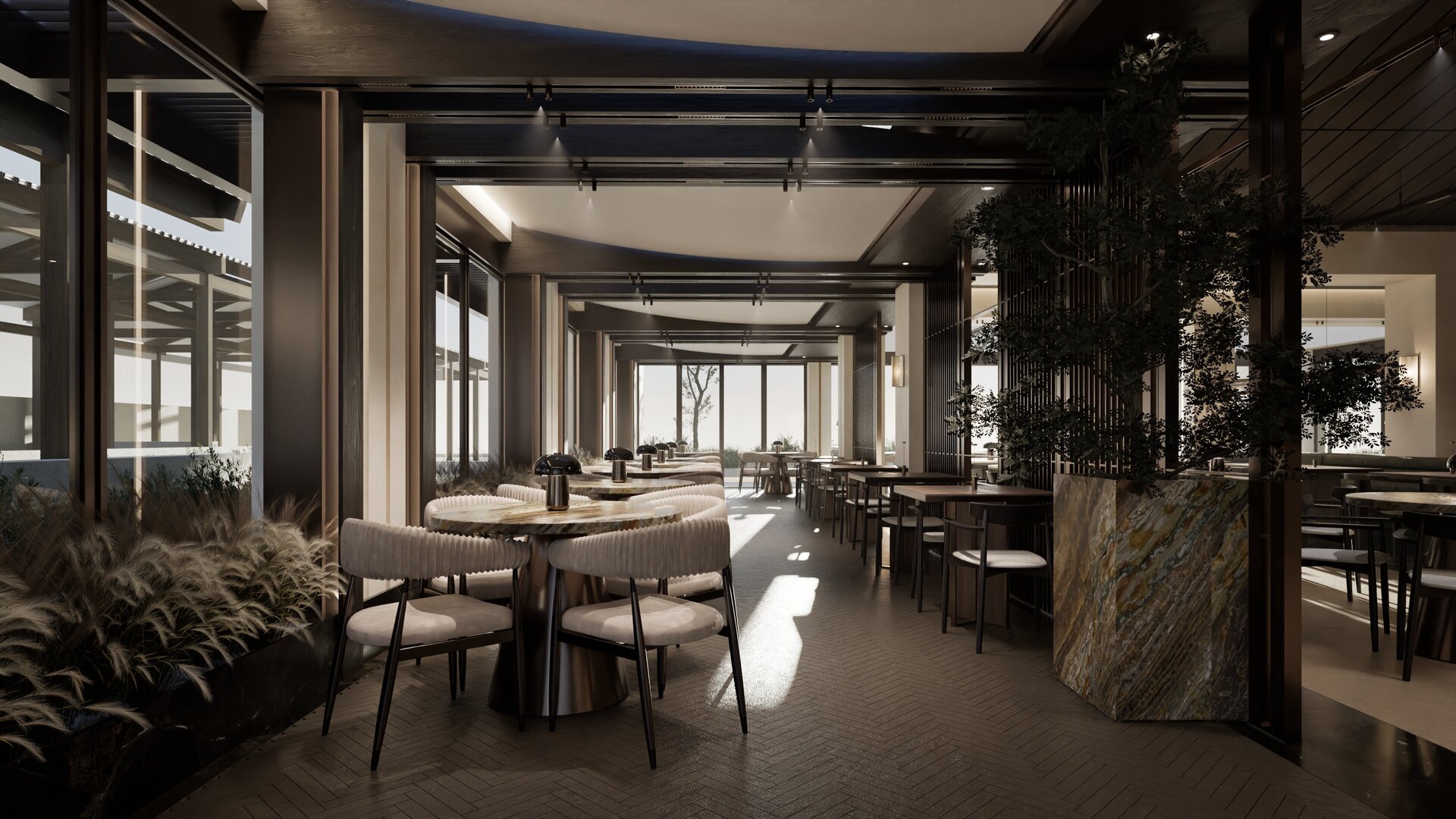 Παράλληλα, τα διαχωριστικά στοιχεία τοποθετούνται με τέτοιο τρόπο ώστε να επιτυγχάνεται η αίσθηση μικρότερης κλίμακας και οικειότητας στον σχεδιασμό, χωρίς ωστόσο να διακόπτεται η οπτική συνέχεια και η συνοχή του ενιαίου χώρου.